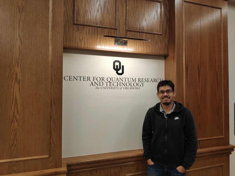 The dedication of the Center for Quantum Research and Technology (CQRT) will take place on Friday, October 25 at 2:30pm. The ceremony will be attended by the Oklahoma governor, OU President, Provost and Dean. The event will be followed by tours in Lin Hall, the state of the art laboratory where the CQRT is housed, and by three lectures in Nielsen Hall. One of the lectures will be offered by Neal Lane, a Senior Fellow in Science and Technology Policy, Professor Emeritus at Rice University and current member of the Board of Visitors of the HLD Department of Physics and Astronomy at OU. All are welcome to attend! The photo shows graduate student Jugal Talukdar, posing in the entrance area of Lin Hall, at the day of the dedication of the CQRT. What an exciting day! And how wonderful to be able to celebrate with so many strong supporters!